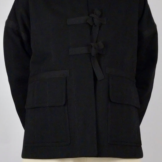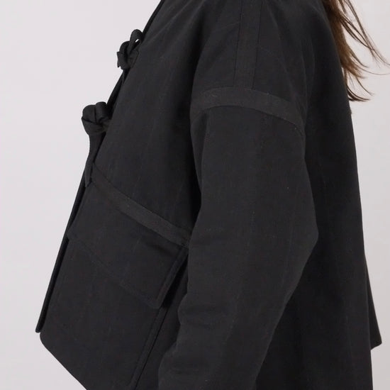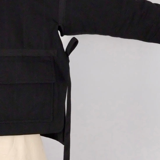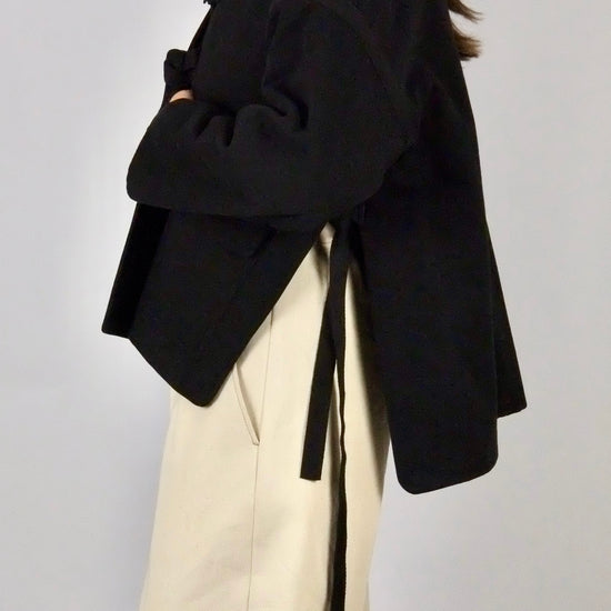 This jacket is fully adjustable with an open side seam and herringbone ties at the waist. It can be worn in multiple ways: tied at the side seam, tied and fitted at the waist, or open and untied, showcasing its a-line shape.