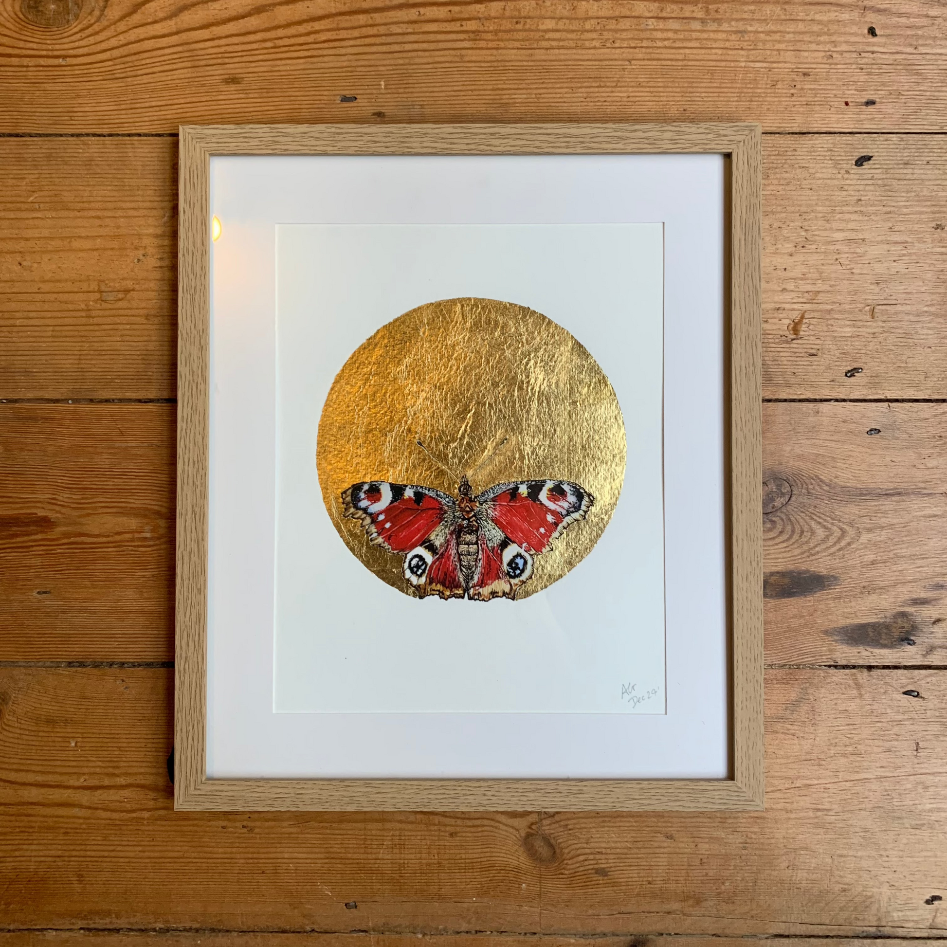 A gorgeous A4 Glicee print with a gorgeous illustration of a Peacock Butterfly and a hand gilded circle.