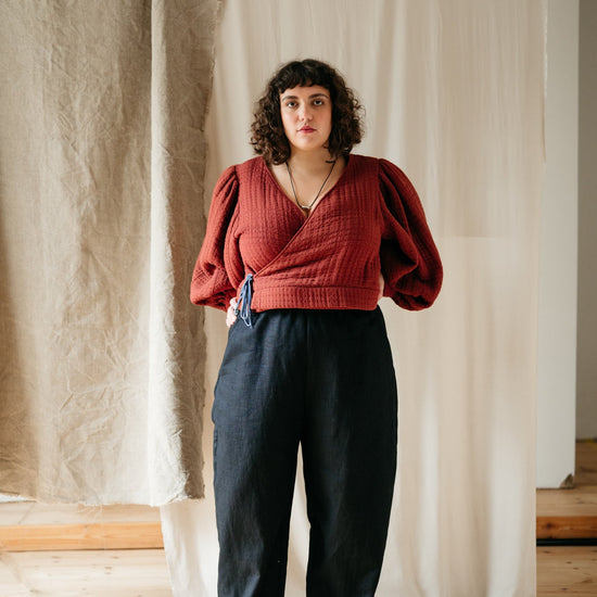 PLEASE NOTE, THE FIRST PHOTO IS OF THE BARREL LEGS IN BLACK RAMIE LINEN, YOU WILL RECEIVE WHAT IS IN THE SECOND IMAGE.