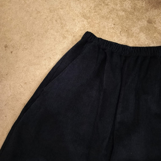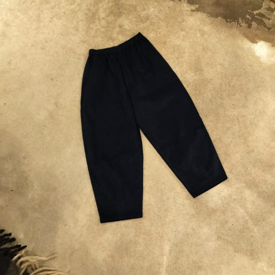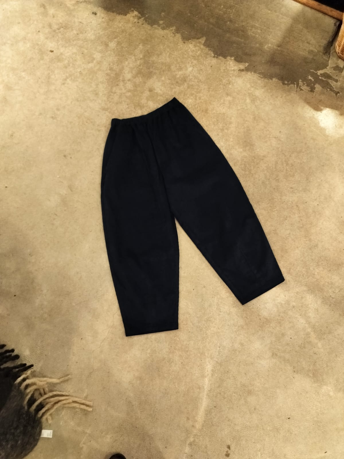 The Barrel Leg trousers are designed with a curved leg shape that gives them a relaxed, slouchy fit, ideal for comfortable everyday wear. They feature a slim, elasticated waistband for easy wear, and the high-waisted cut flatters the figure. The addition of pockets makes them practical as well as stylish. The trousers are made from navy corduroy, ensuring durability while maintaining their structured look.