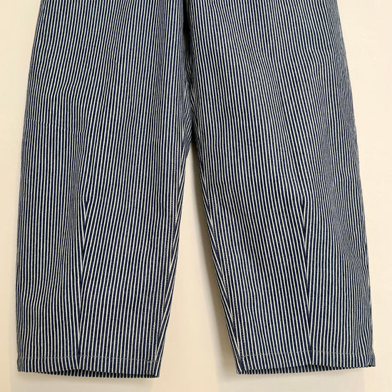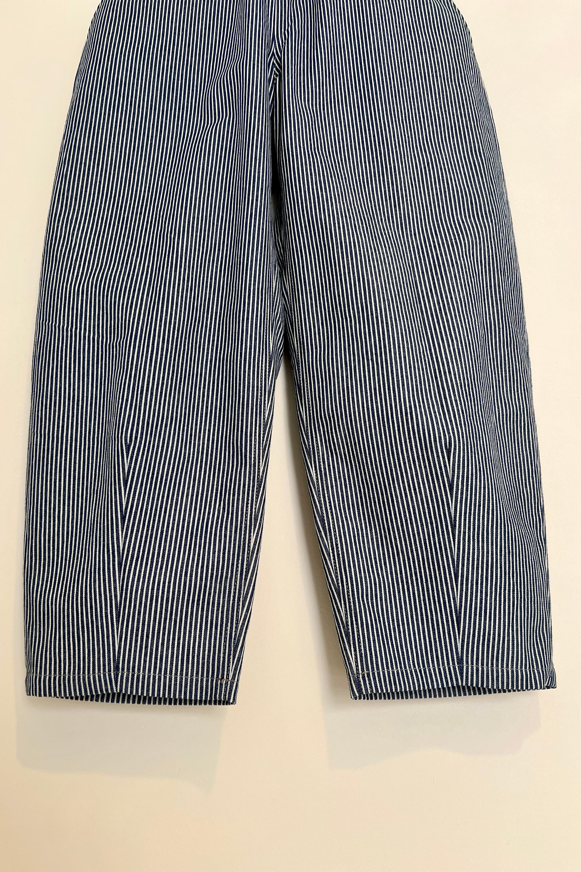Crafted from non-stretch 100% cotton navy and white striped denim, these trousers hold their structure beautifully while softening over time with wear. Functional side pockets and minimal detailing allow the silhouette and fabric to shine. Pair them with oversized knits, crisp shirting, or simple tees for effortless, seasonless style.