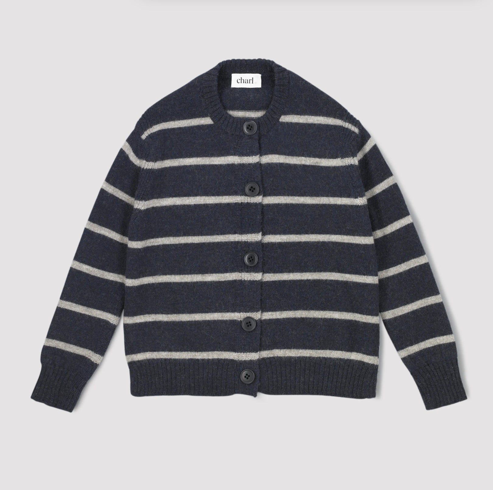 The over-sized buttons are made from natural corozo nut and match the Navy blue of the stripe.