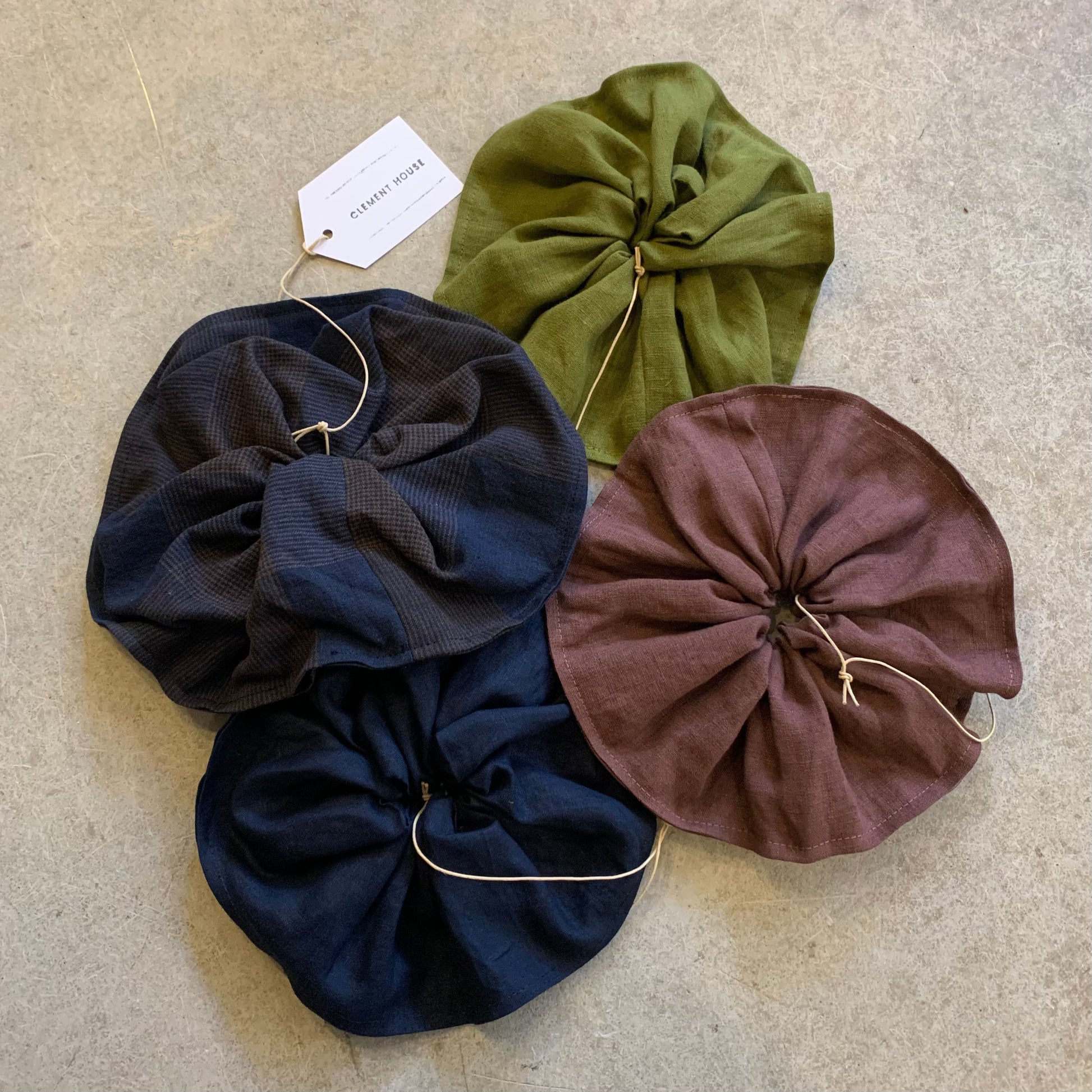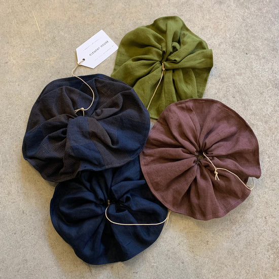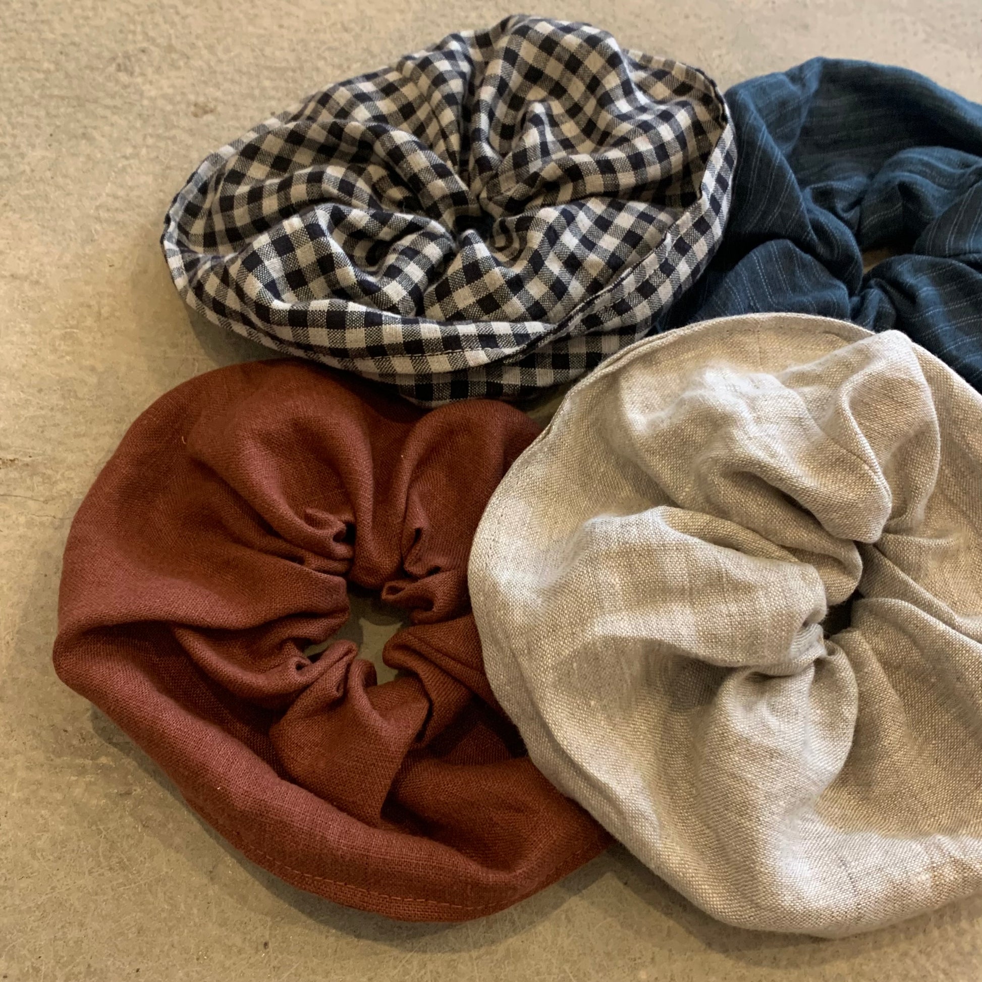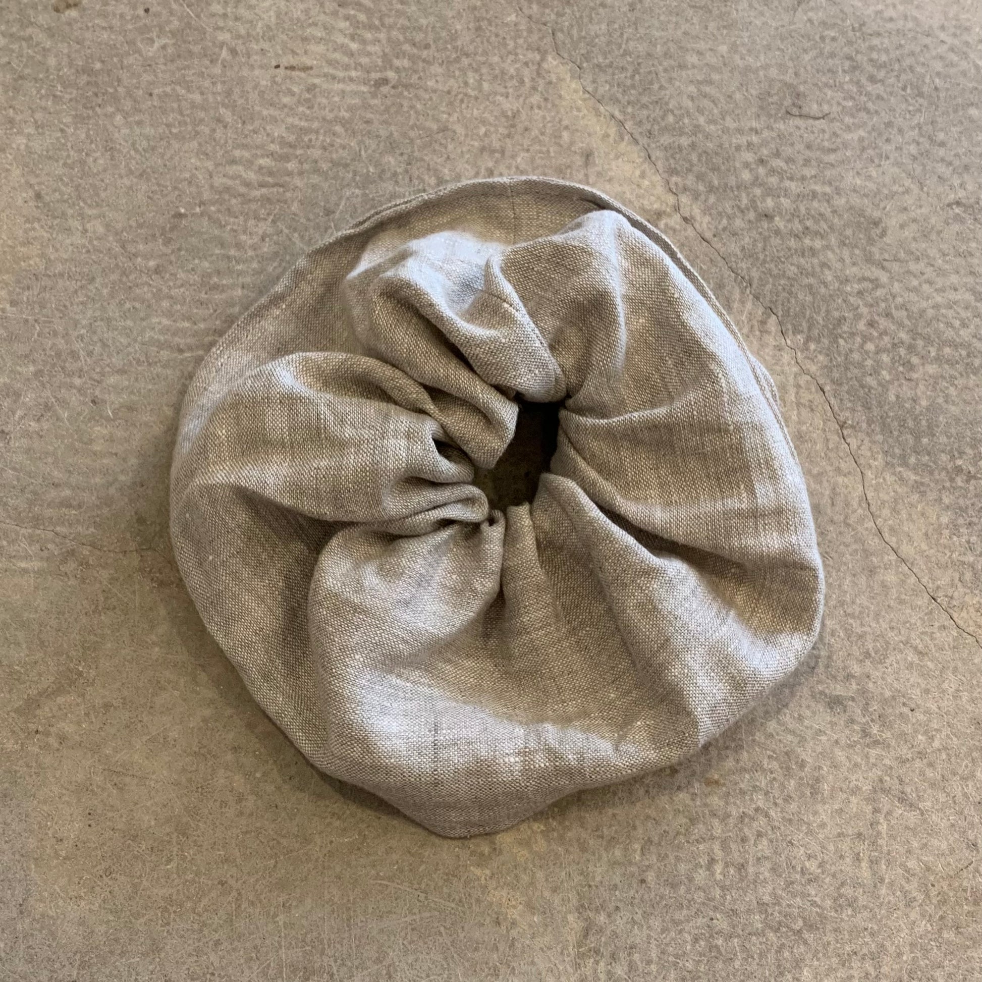 A beautiful, statement scrunchie made to elevate every outfit in a variety of fabrics which are offcuts from garment production. Made from linen and deadstock (polyester) taffeta, organic cotton thread, organic elastic (60% organic cotton, 40% natural rubber).