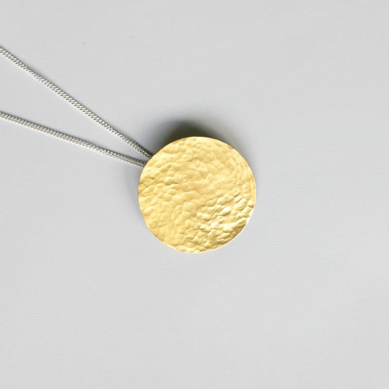 Brass pendant with a hammered finish. Made in Norwich by Sara, founder of Kano. Her work is inspired by many sources; the ancient metalwork of classical and non-classical cultures and the natural organic shapes that can be found in rocks and landscapes.