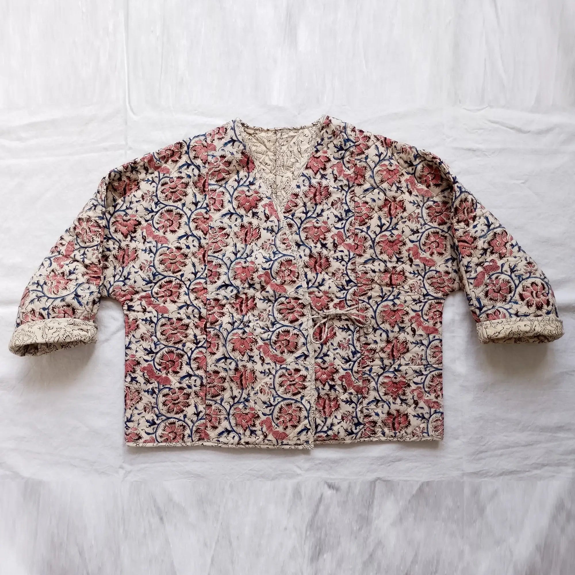 A fully reversible wrap style jacket with one side printed with a pink floral effect and the other side in a cream with black outline print. This garment is 100% cotton and fits oversized.
