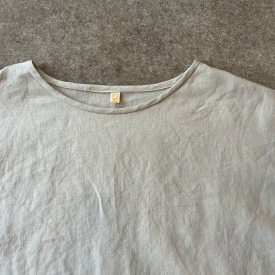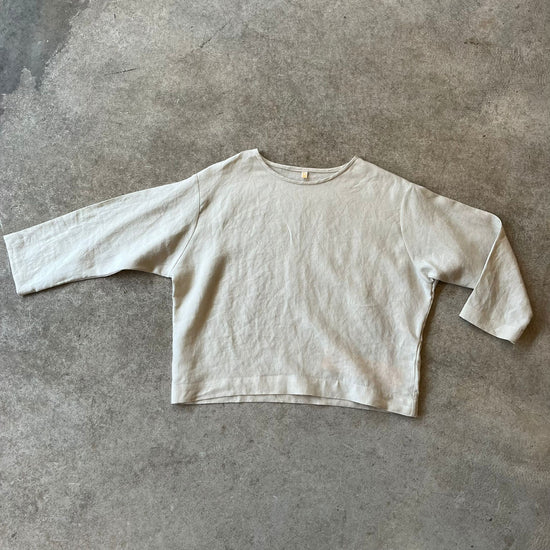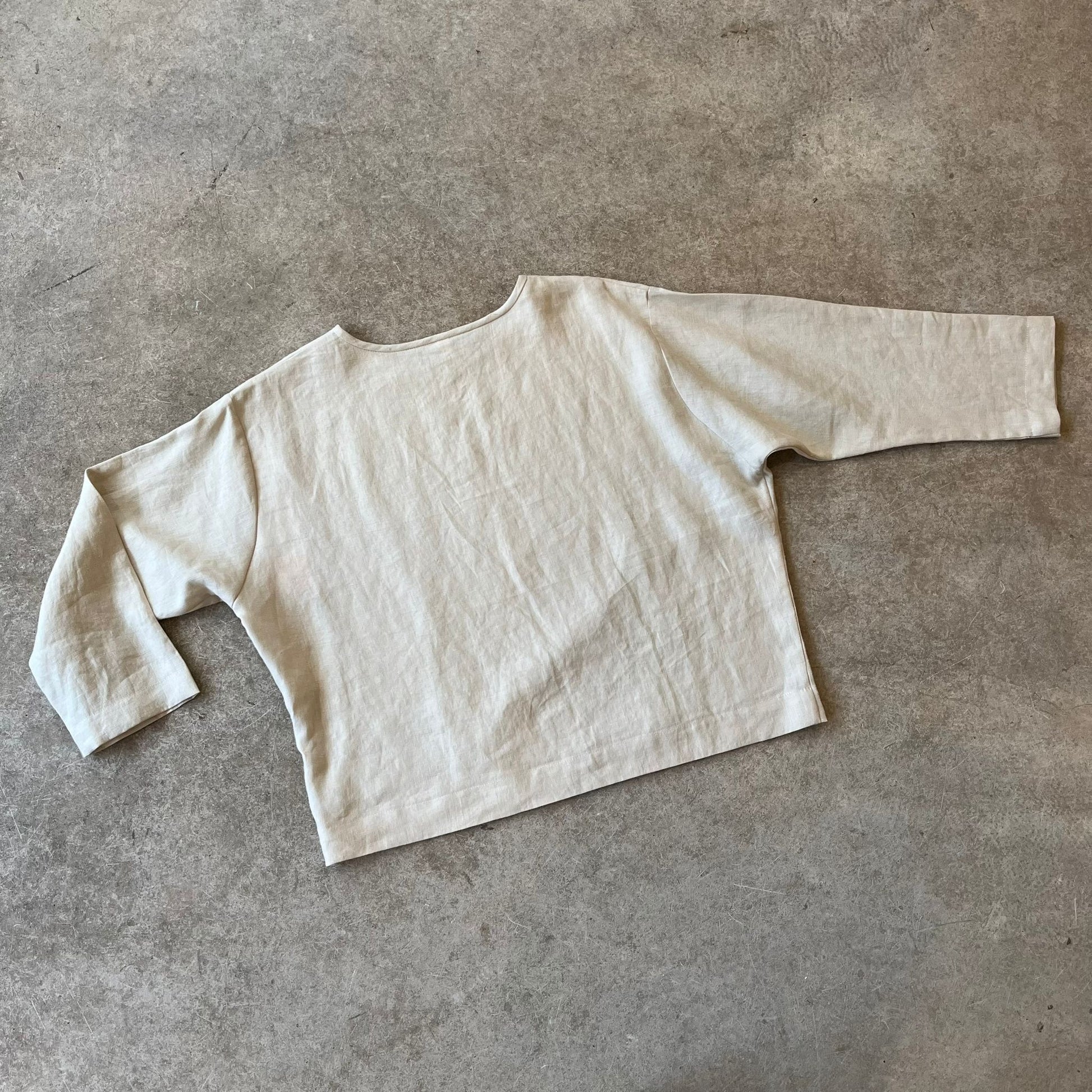 The Plain and Simple Top in ‘Sand’ linen, with a round neck, long sleeves and boxy shape, is a versatile addition to your wardrobe.