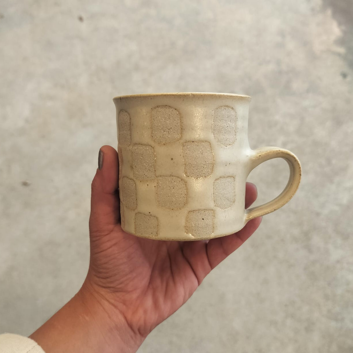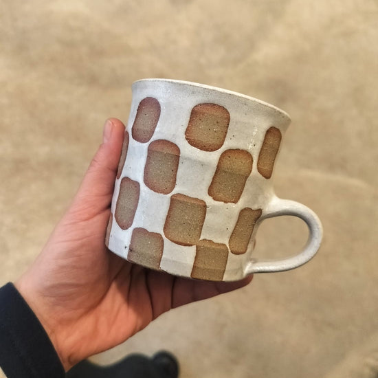 These mugs are perfect for all your hot drink needs! Designed with a fun checkerboard pattern going all the way round. The Stoneware version in Olive, Panna cotta and Natural are wax resisted then glazed all round to create the pattern while the Terracotta is painted on in slip and then glazed on the inside.