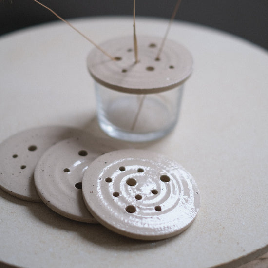 A wheel thrown ceramic stem holder in a speckled glaze finish. Place on top of a flat top vessel.