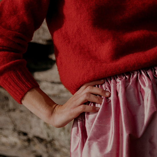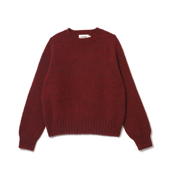 The Ada crewneck sweater in soft lambswool in a Donegal style. A rich claret red with textured flecks of colour including orange and teal. It pairs well with both darker shades like chocolate brown, denim and navy and lighter white and ecru tones.