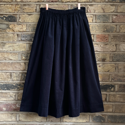 The Tina skirt is a midi length, voluminous skirt made in a beautiful corduroy navy/black ink colour. With an elasticated waist and side pockets, we guarantee you will reach for this versatile piece a lot. Can be worn at the waist or on the hips due to the elastic waist.
