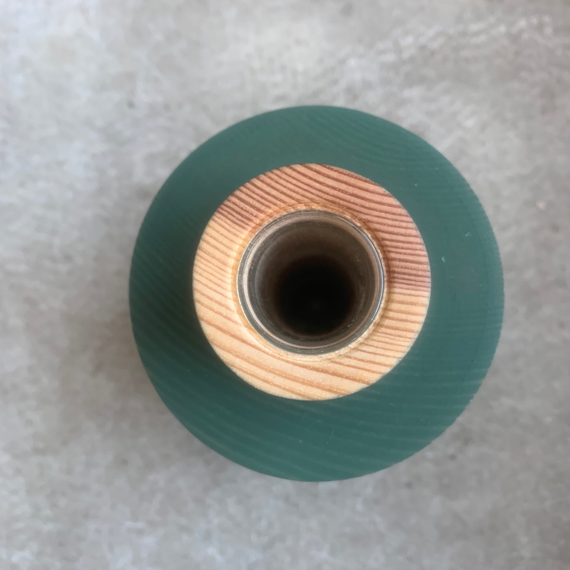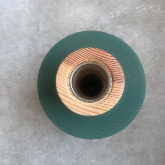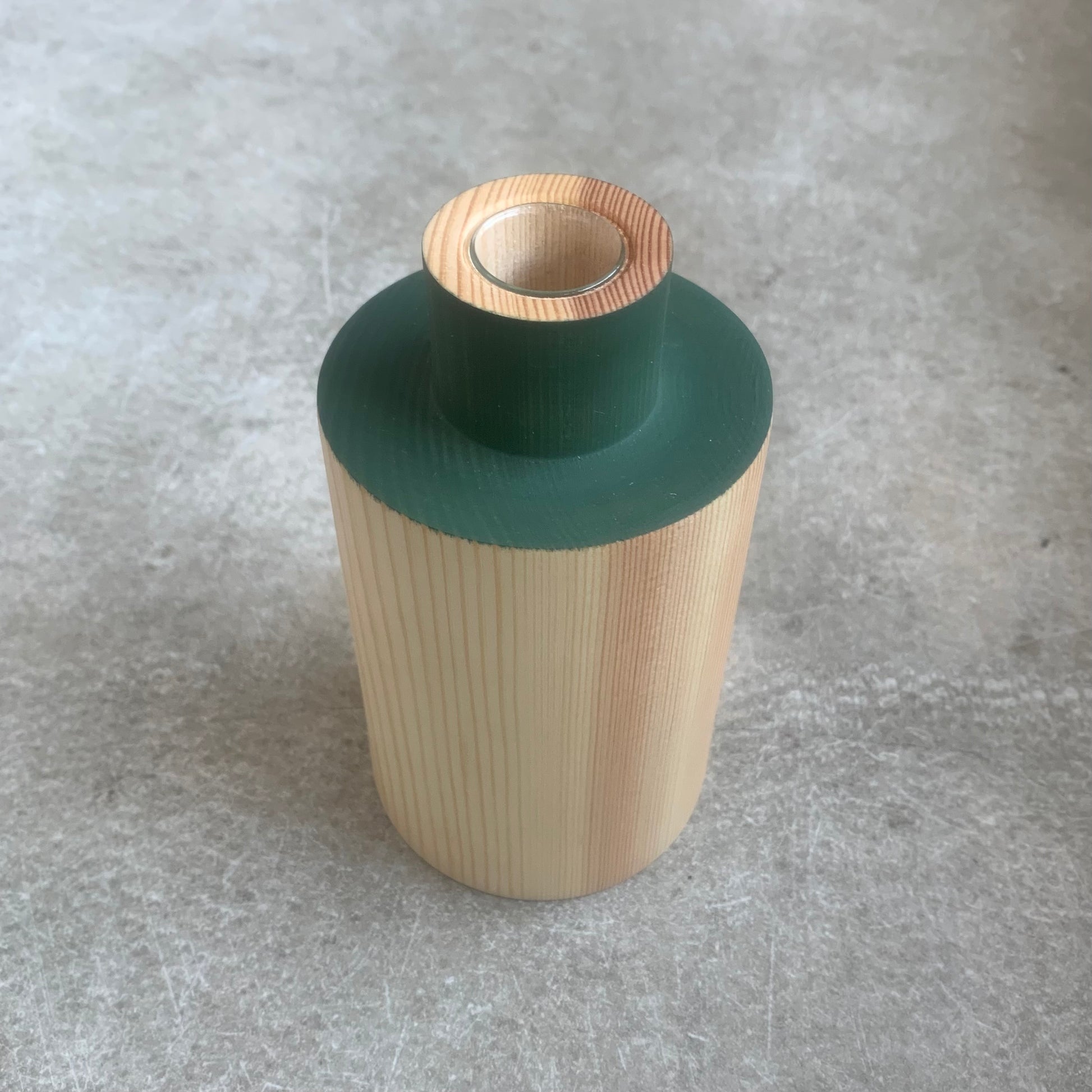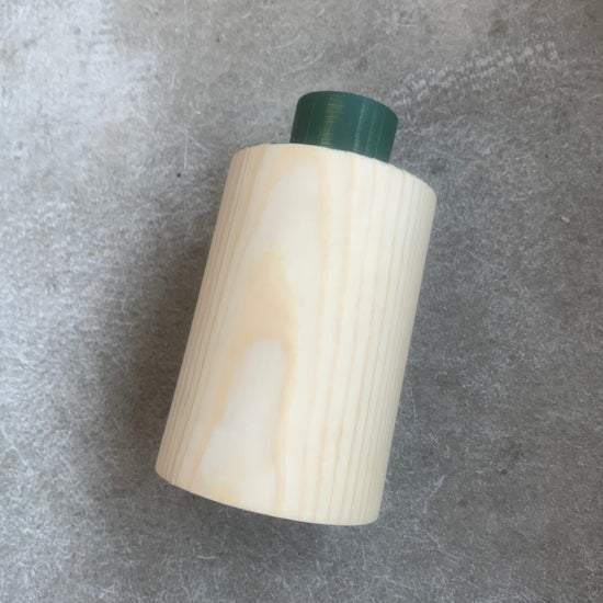 This vase is hand crafted from Pine and features a dark green wood stain