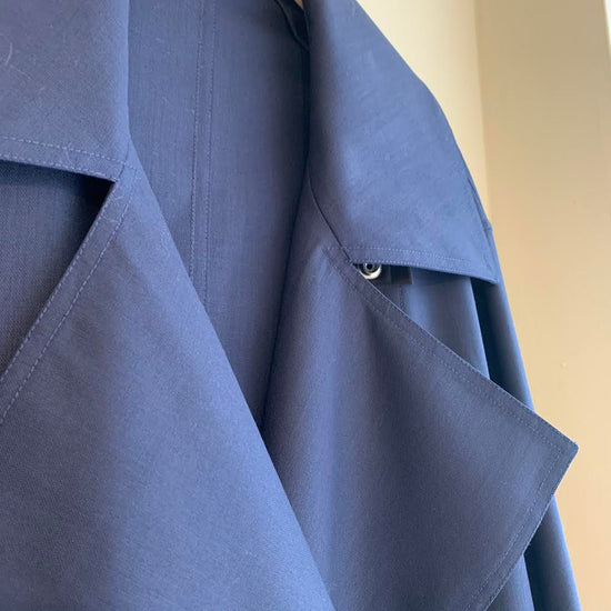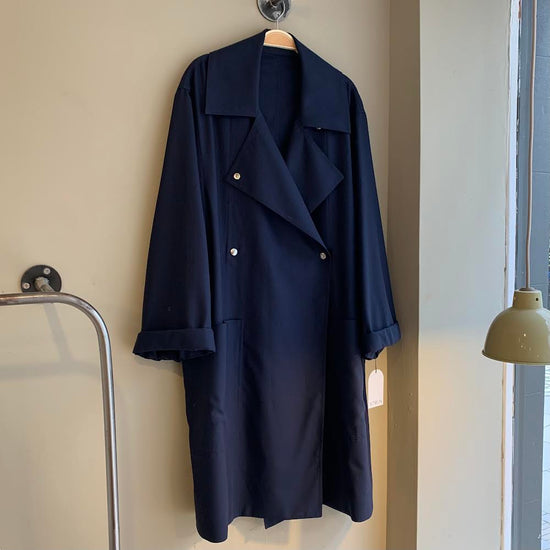 This giant trench coat has a relaxed, voluminous fit with dropped shoulders, a double-breasted front closure and large collar. It features two lined patch pockets, deep set-in sleeves, stainless steel hardware and double top-stitching throughout.