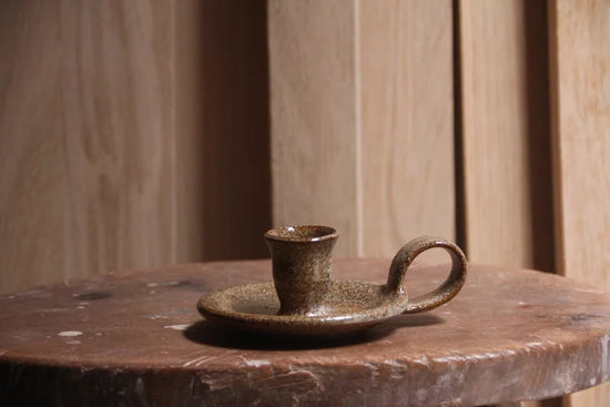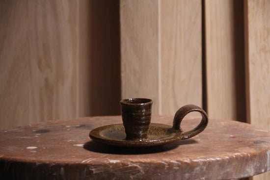 A wheel thrown candleholder Wee Willy Winky would be proud of. Choose from a deep rich tobacco glaze, lighter brown fleck glaze or a white glaze.