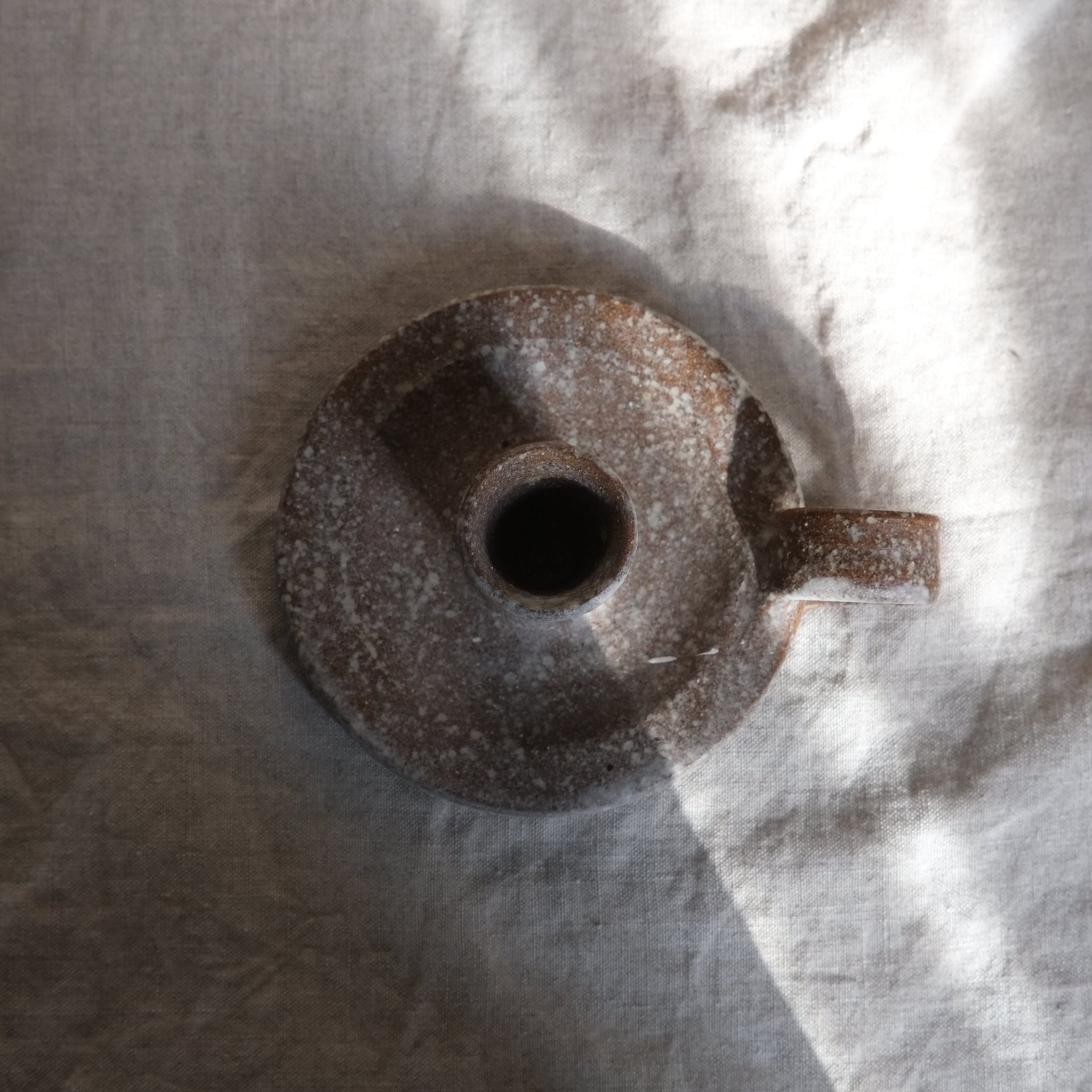 A simple candleholder thrown on the wheel in a lovely dark clay and glaze in a matte opaque glaze.