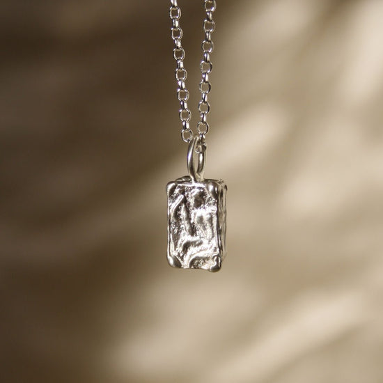 A small rectangular pendant that has an imprint of Herecles on one side and Greek text on the other made from recycled silver on an 18" Silver chain.