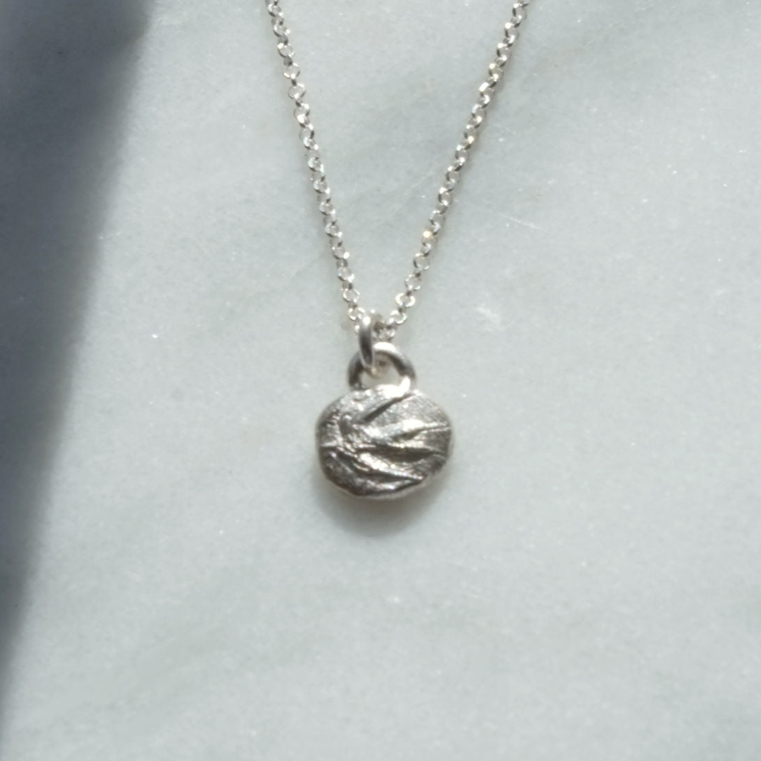 A small pendant with an imprint of a swallow made from recycled sterling silver on an 18" chain.