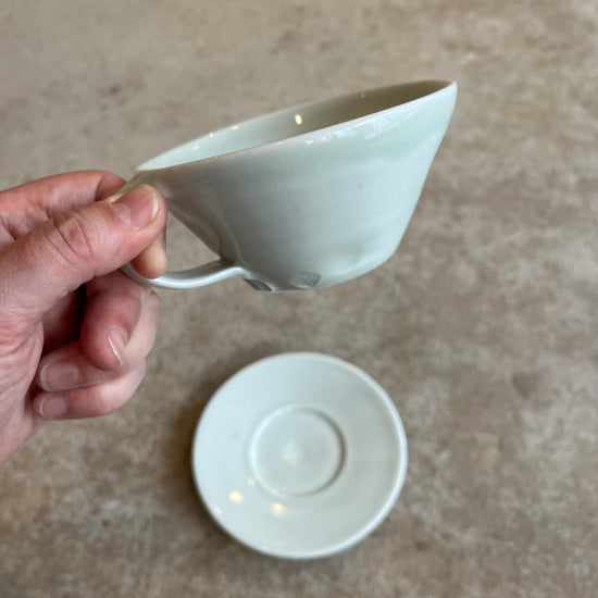 These tea cups and saucers aremade from porcelain and glazed in a beautiful, blue green celadon glaze. The cup has a wide brim tapering down to a smaller base.