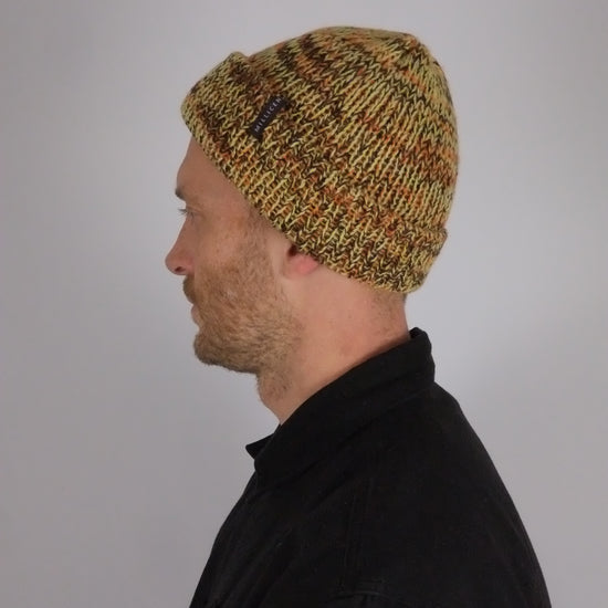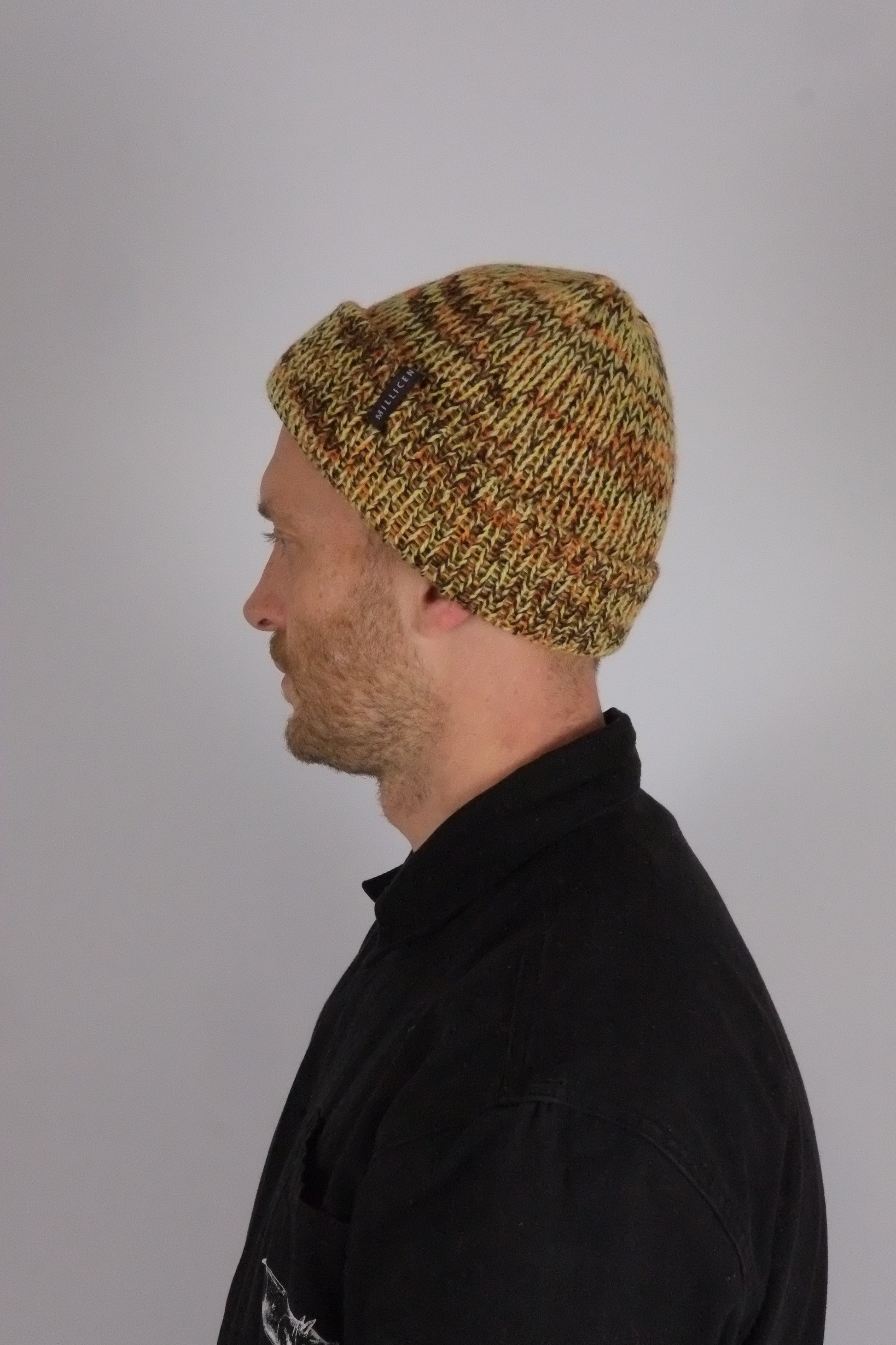 Soft cosy wooly hats in speckled colour ways that are made from leftover yarn.