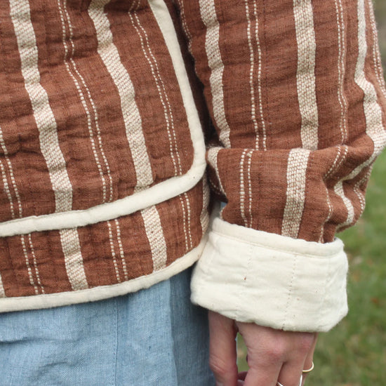 Stunning quilted jacket with a boxy fit. It’s quilted using cotton wading and the buttons are made from corozo. Finished with two large patch pockets.
