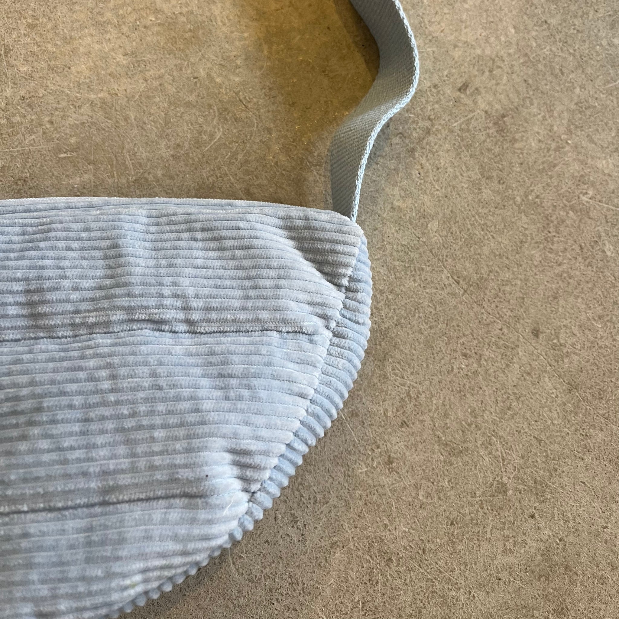 Padded cross body gusseted bag in Sky Blue cord with Blue lining and zip. Adjustable strap plus two inner side compartment pockets.