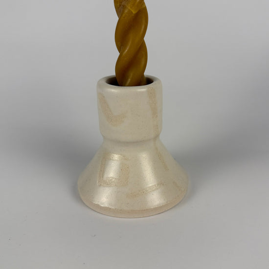 A wheel-thrown candlestick made from a stoneware clay and hand decorated. From Sarah’s collection of work inspired by archaeological excavation and the subtleties of form and hidden surfaces. Using a water-etching, where the clay is eroded with water and pressure, to produce a surface reminiscent of archaeological and geological deposits. Glimpses of these patterns continue onto the surrounding surface, marked out by an exposed line of unglazed clay.