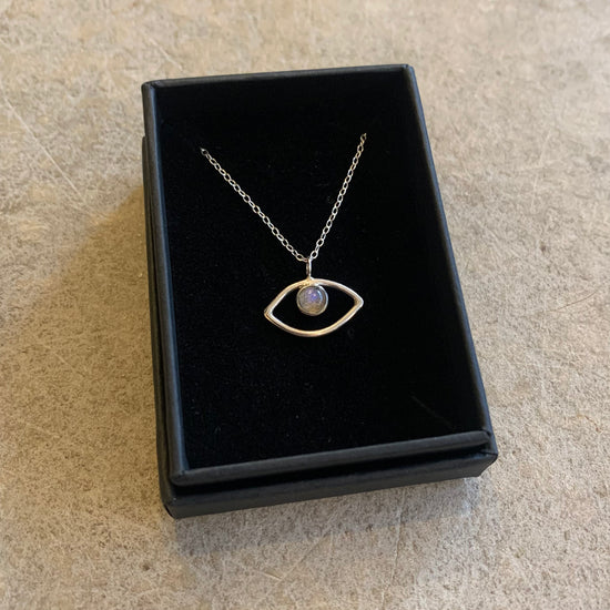 This necklace has a stunning 5mm natural labradorite set into a sterling silver bezel with an eye motif. Finished off with a sterling silver chain.