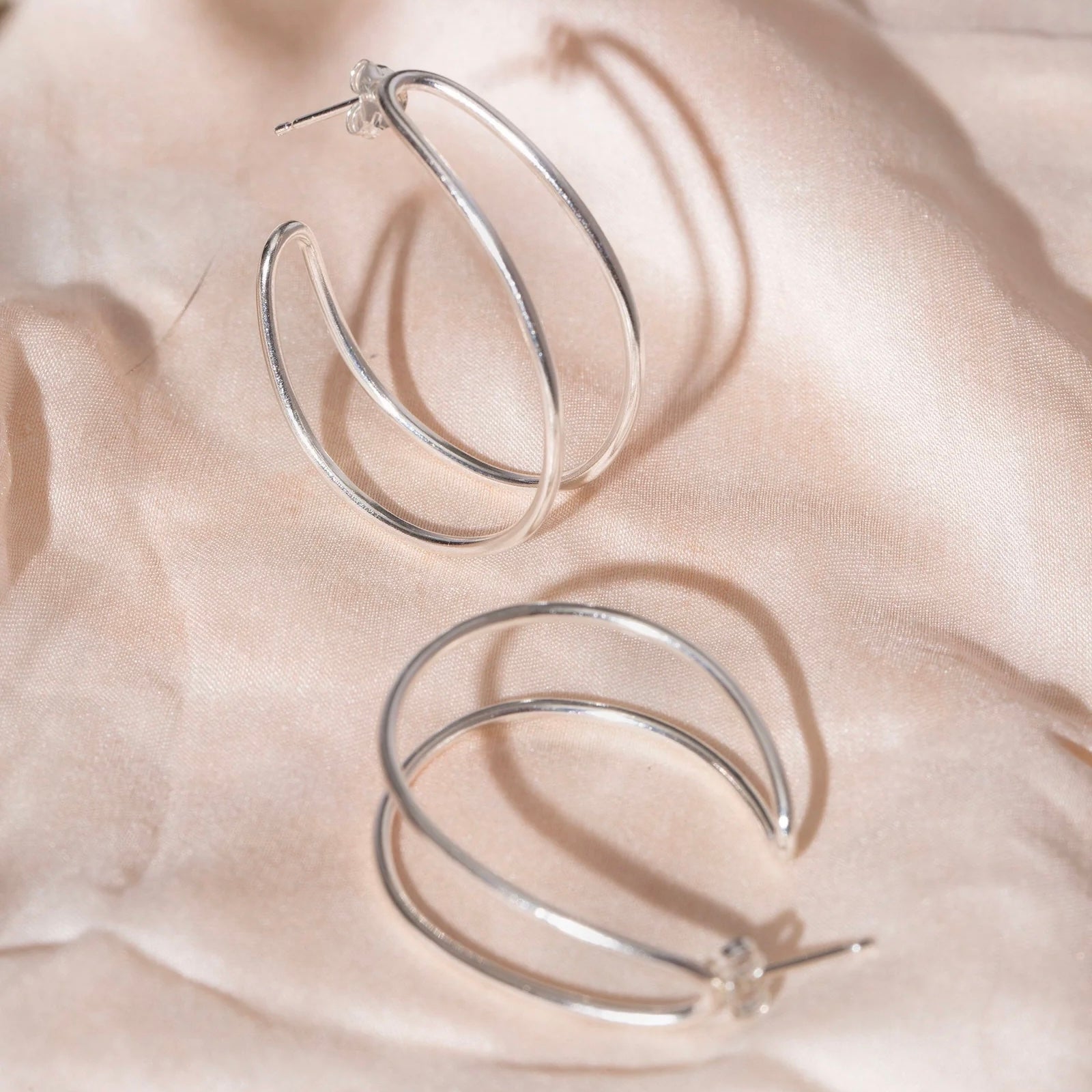 A pair of intriguing hoops that give the illusion of 2 hoops together. A lightweight and versatile pair, perfect to be worn both day and night. A modern take on a jewellery classic. Made from Eco Recycled Silver.