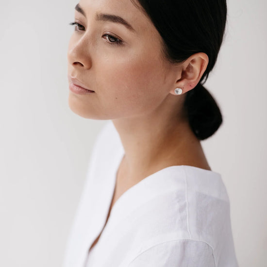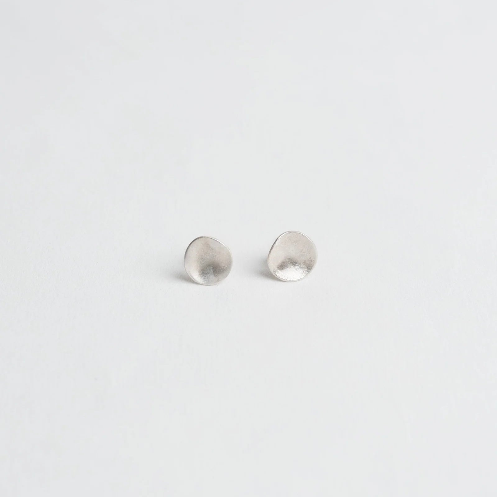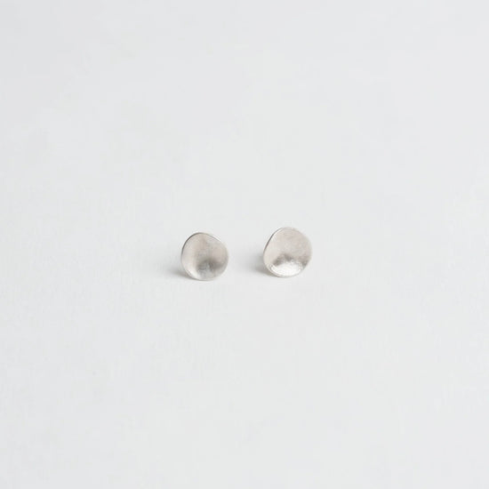 A pair of silver simple everyday studs made by heating the round discs close to melting point resulting in a beautiful matte rippled texture which is unique to each earring. These make the perfect everyday studs.