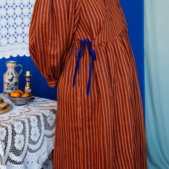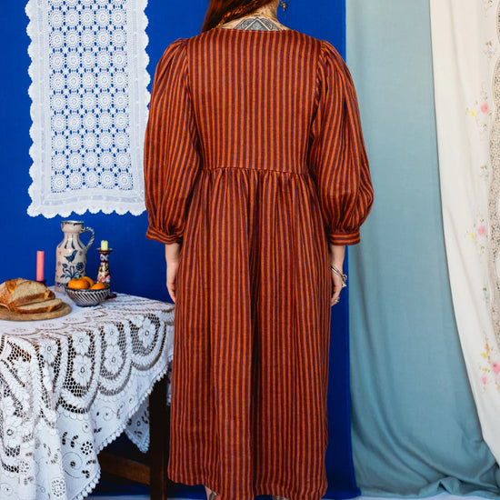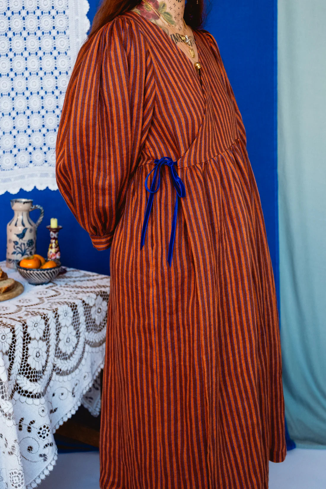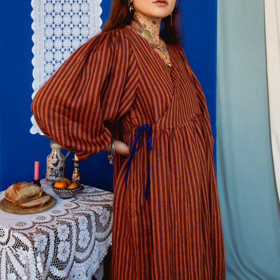 The stunning signature Tapuh Cloud 9 dress comes in toasted cinnamon stripe. The fabric is 100% Eastern European linen and have a lovely structure and weight to it. The dress features voluminous statement sleeves, velvet ribbon wrap over tie and two in seam pockets