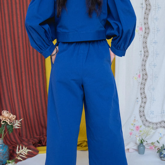 The Rebecca Trousers are lovely, wide leg trousers with an elasticated waist. Made in a gorgeous navy 100% cotton medium weight twill