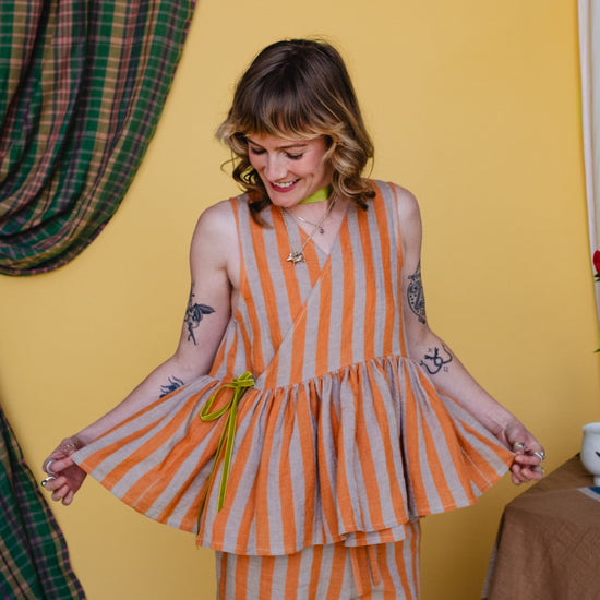 A lovely sleeveless wrap top a peplum feature and a tie fastening in a beautiful taupe and orange stripe linen.