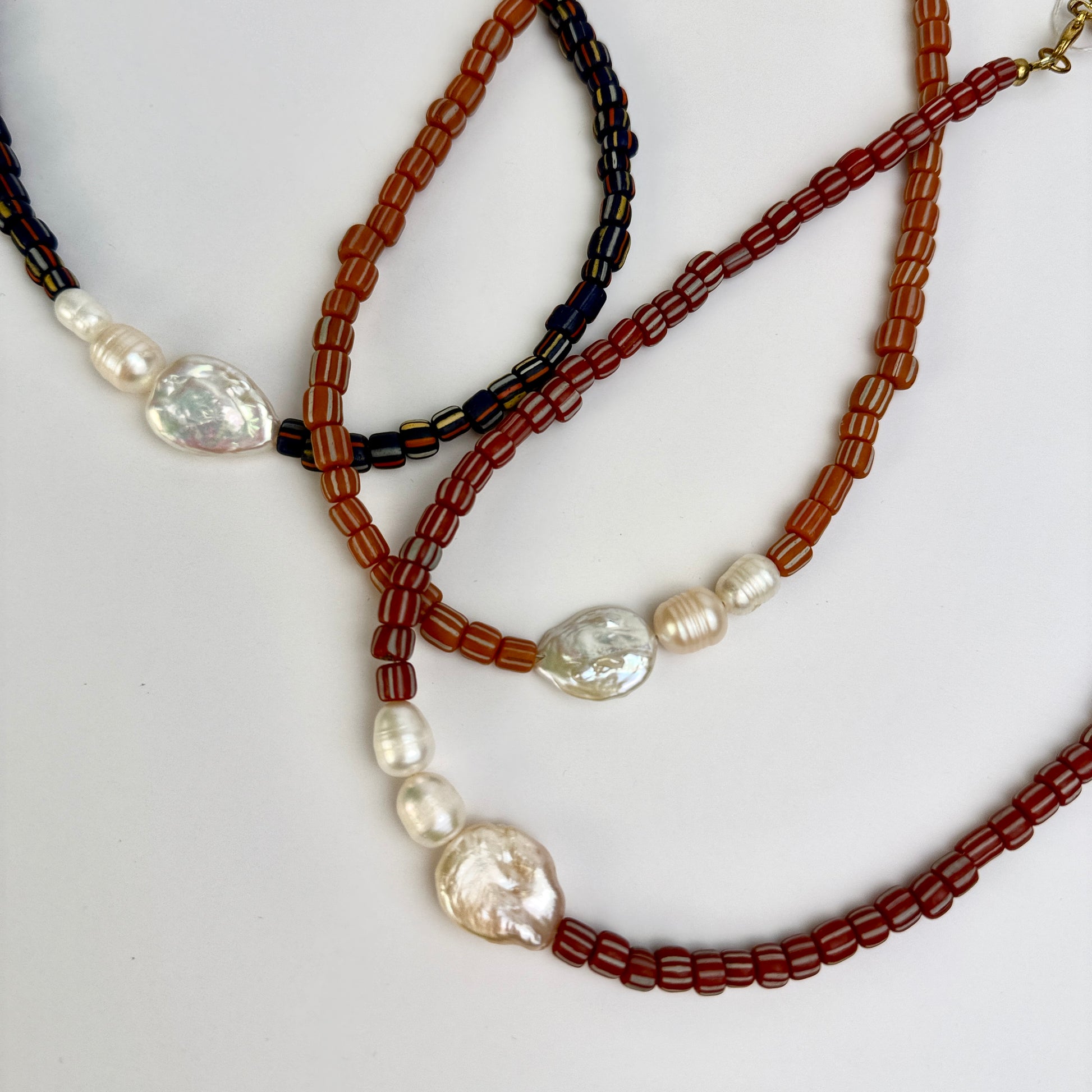 These beautiful beaded necklaces are perfect for adding a bit of colour to any outfit. Made from reclaimed pearls, including the larger coin pearl, and Indonesian glass striped beads with gold toned fastenings.