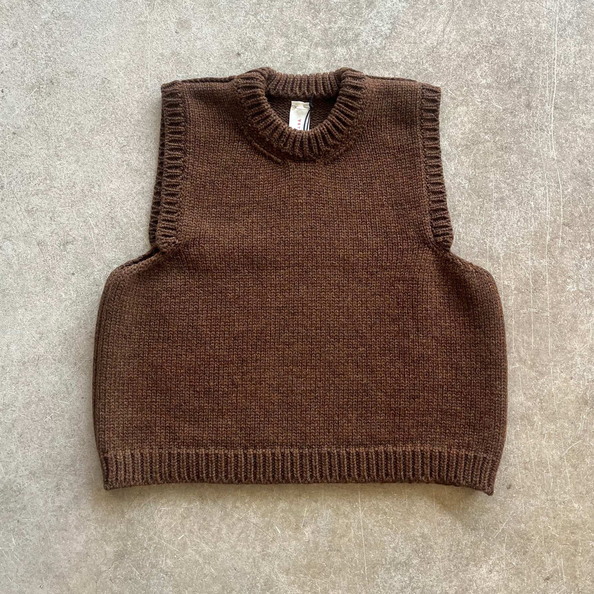This heavy knit vest is made from 100% British wool. Features a crew neck line .