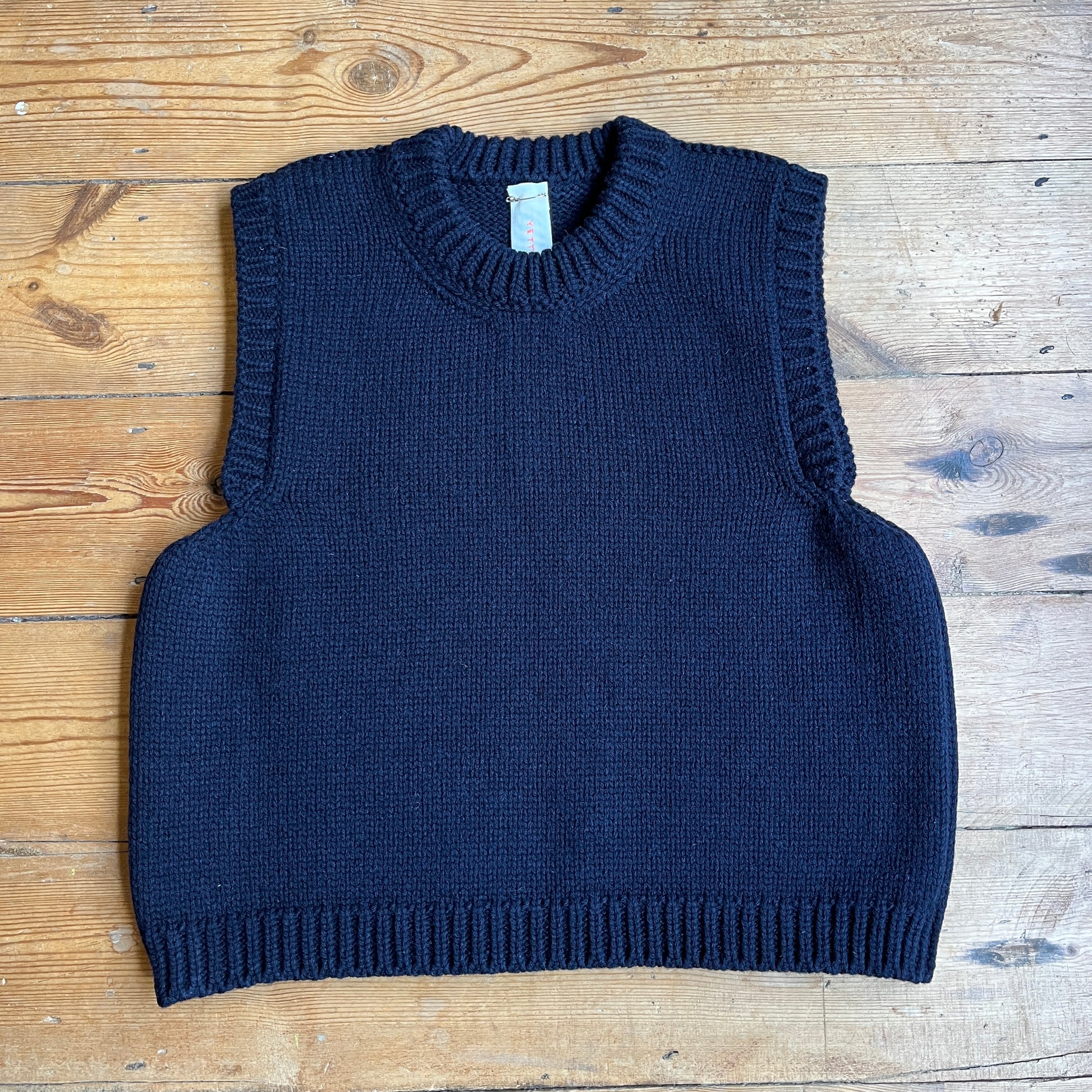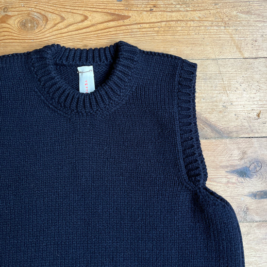 This heavy knit vest is made from 100% British wool. Features a crew neck line .